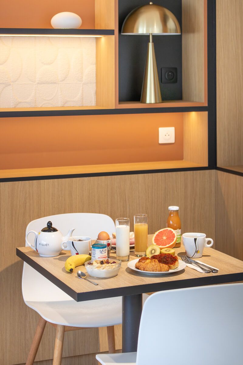 For drinks, we offer you 100% natural fruit juices " des Pressoirs de Provence ", but also fresh oranges to squeeze your morning orange juice yourself.